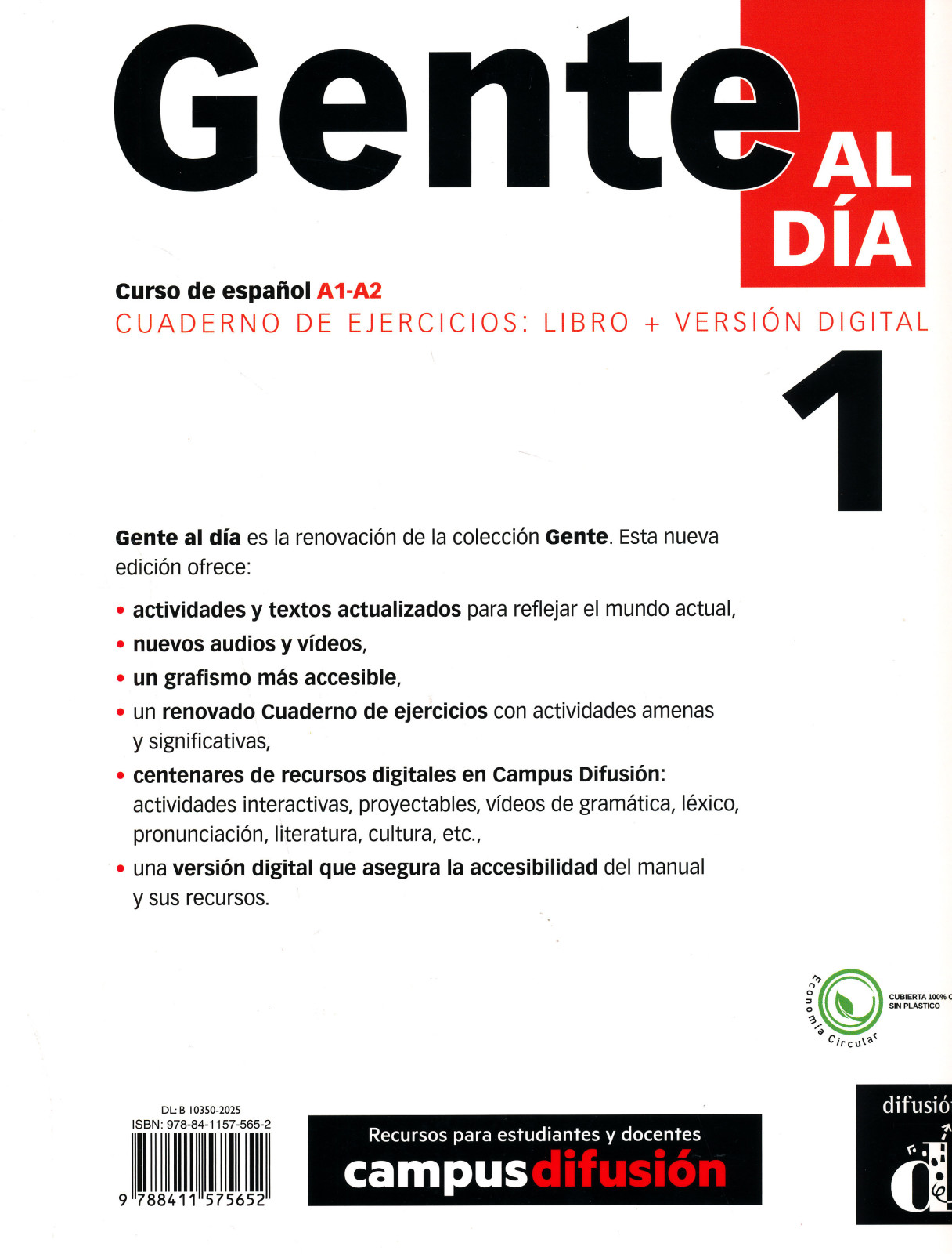 A Gente al día munkafüzetnek digitális változata is van, amely elérhető a Campus Difusión platformon.<Enter>A Gente al día a népszerű Gente sorozat megújított kiadása, amely a mai világ igényeihez igazítva kínál modern, motiváló tanulási élményt.