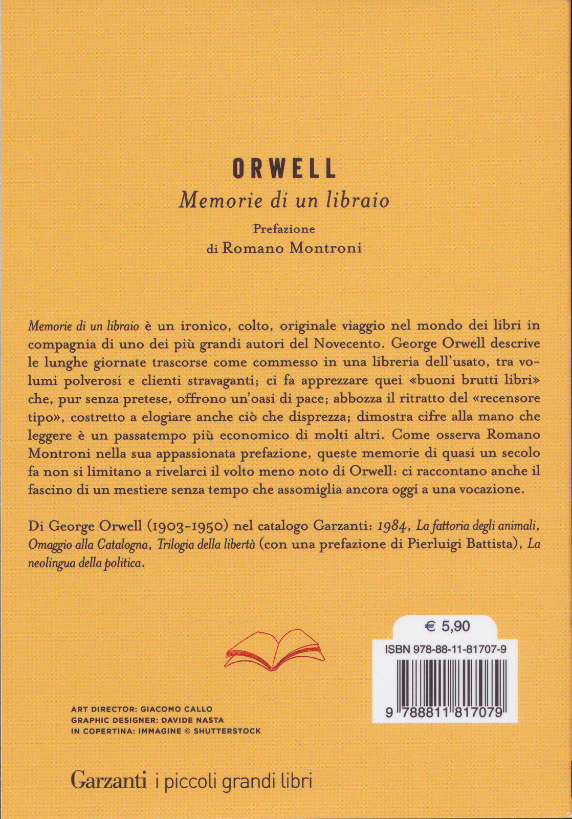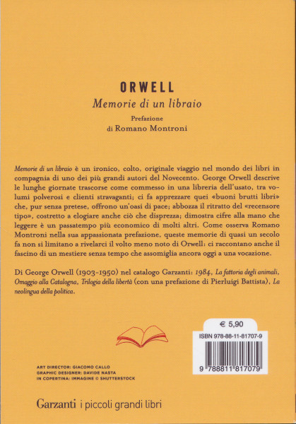 Memorie di un libraio e un ironico, colto, originale viaggio nel mondo dei libri in compagnia di uno dei piu grandi autori del Novecento. George Orwell descrive le lunghe giornate trascorse come commesso in una libreria dell'usato, tra volumi polverosi e clienti stravaganti; ci fa apprezzare quei «buoni brutti libri» che, pur senza pretese, offrono un'oasi di pace; abbozza il ritratto del «recensore tipo», costretto a elogiare anche cio che disprezza; dimostra cifre alla mano che leggere e un passatempo piu economico di molti altri. Come osserva Romano Montroni nella sua appassionata prefazione, queste memorie di quasi un secolo fa non si limitano a rivelarci il volto meno noto di Orwell: ci raccontano anche il fascino di un mestiere senza tempo che assomiglia ancora oggi a una vocazione.