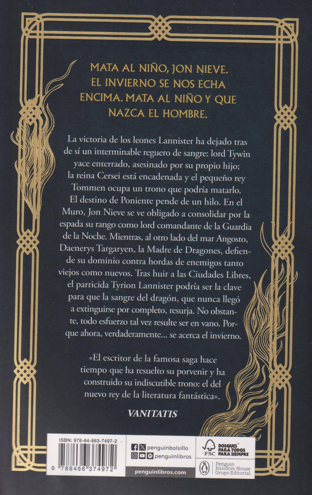 La victoria de los leones Lannister ha dejado tras de sí un interminable reguero de sangre: lord Tywin yace enterrado, asesinado por mano de su propio hijo; la reina Cersei está encadenada y el pequeno rey Tommen ocupa un trono que podría matarlo. El destino de Poniente pende de un hilo.En el Muro, Jon Nieve se ve obligado a consolidar por la espada su rango como lord comandante de la Guardia de la Noche. Mientras, al otro lado del mar Angosto, Daenerys Targaryen, la Madre de Dragones, defiende su dominio contra hordas de enemigos tanto viejos como nuevos.Tras huir a las Ciudades Libres, el parricida Tyrion Lannister podría ser la clave para que la sangre del dragón, que nunca llegó a extinguirse por completo, resurja. No obstante, todo esfuerzo tal vez resulte ser en vano. Porque ahora, verdaderamente... se acerca el invierno.