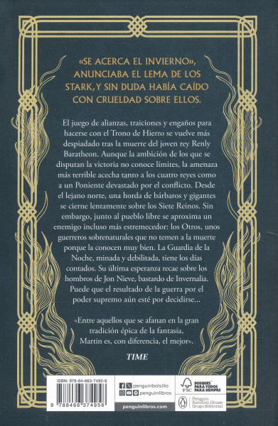 Aunque la ambición de los que se disputan la victoria no conoce límites, la amenaza más terrible acecha tanto a los cuatro reyes como a un Poniente devastado por el conflicto. Desde el lejano norte, una horda de bárbaros y gigantes se cierne lentamente sobre los Siete Reinos. Sin embargo, junto al pueblo libre se aproxima un enemigo incluso más estremecedor: los Otros, unos guerreros sobrenaturales que no temen a la muerte porque la conocen muy bien. La Guardia de la Noche, minada y debilitada, tiene los días contados. Su última esperanza recae sobre los hombros de Jon Nieve, bastardo de Invernalia. Puede que el resultado de la guerra por el poder supremo aún esté por decidirse..