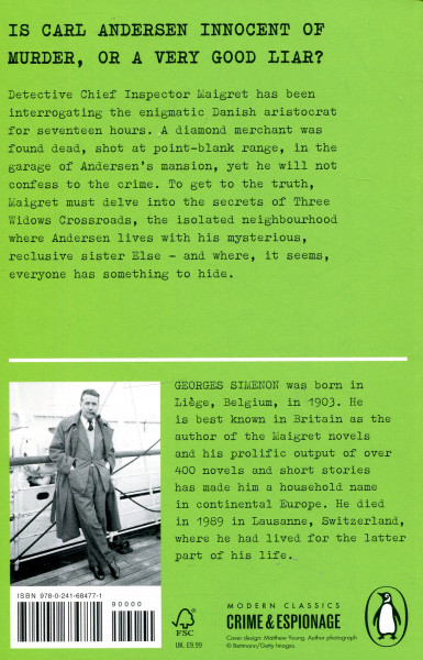 A diamond merchant was found dead, shot at point-blank range, in the garage of Andersen’s mansion, yet he will not confess to the crime. To get to the truth, Maigret must delve into the secrets of Three Widows Crossroads, the isolated neighbourhood where he lives with his mysterious, reclusive sister Else – and where, it seems, everyone has something to hide.