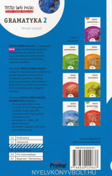 Książka zawiera:• 70 ćwiczeń + klucz• kompleksowy wybór różnorodnych ćwiczeń automatyzujących zagadnienia gramatyczne z poziomów A2-B1, atrakcyjne ilustracje• słowniczek PL / ENG / DE• praktyczne i jasno sformułowane reguły gramatyczne (ENG)• test końcowy"TESTUJ SWÓJ POLSKI – Gramatyka 2" to zbiór ćwiczeń, które można wykorzystać do samodzielnej nauki oraz jako materiał pomocniczy do zajęć w grupie. Książka przeznaczona dla młodzieży i dorosłych na poziomach B1-B2, którzy chcą powtórzyć i utrwalić gramatykę łącząc zabawę z nauką. Bogato ilustrowane ćwiczenia motywują do nauki.