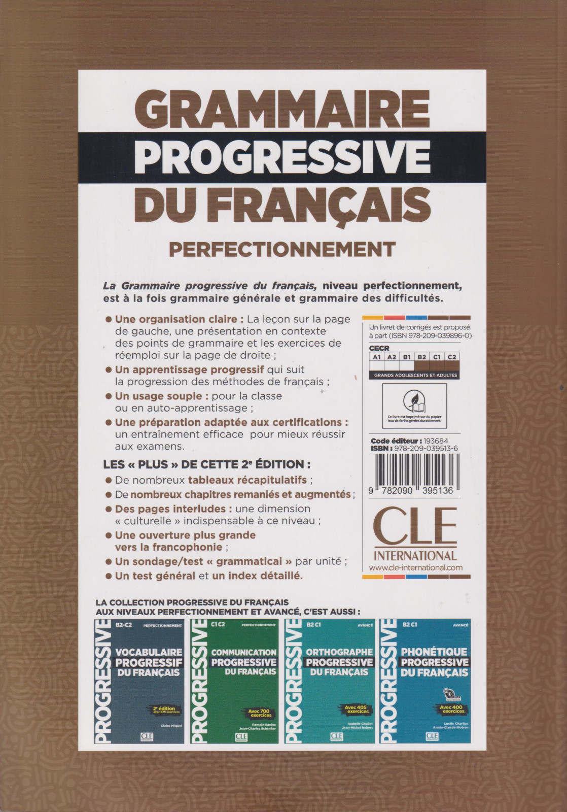 Une organisation claire: la leçon sur la page de gauche, une présentation en contexte des points de grammaire et les exercices de réemploi sur la page de droiteUn apprentissage progressif: il suit la progression des méthodes de françaisUn usage souple: pour la classe ou en auto-apprentissageUne préparation adaptée au certifications: un entrainement efficace pour mieux réussir aux examensLes "plus" de cette deuxieme édition :De nombreux tableaux récapitulatifsDe nombreux chapitres remaniés et augmentésDes pages interludes : une dimension "culturelle" indispensable a ce niveauUne ouverture plus grande vers la francophonieUn sondage/test "grammatical" par unitéUn test général et un index détaillé