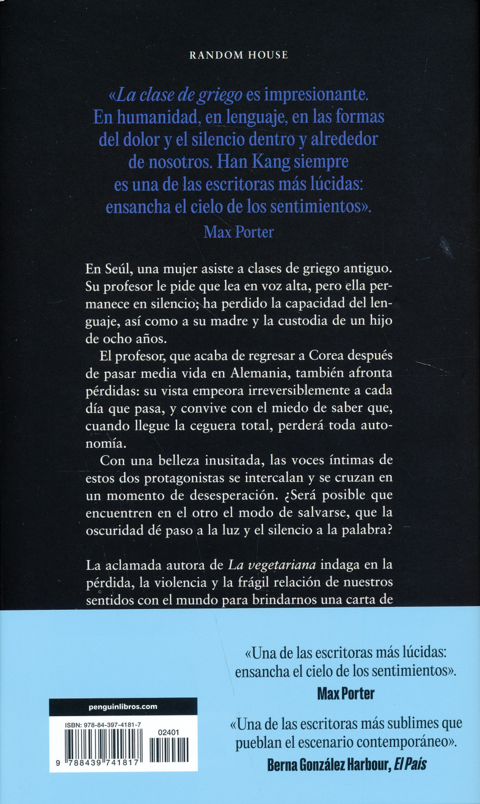 En Seúl, una mujer asiste a clases de griego antiguo. Su profesor le pide que lea en voz alta pero ella permanece en silencio; ha perdido la capacidad del lenguaje, así como a su madre y la custodia de un hijo de ocho anos. Su única esperanza de recuperar el habla es mediante el aprendizaje de una lengua muerta.El profesor, que acaba de regresar a Corea después de pasar media vida en Alemania, se encuentra dividido entre dos culturas y dos lenguas. También él afronta pérdidas: su vista empeora irreversiblemente a cada día que pasa, y convive con el miedo de saber que, cuando llegue la ceguera total, perderá toda autonomía.Con una belleza inusitada, las voces íntimas de estos dos protagonistas se intercalan y se cruzan en un momento de desesperación. ?Será posible que encuentren en el otro el modo de salvarse, que la oscuridad dé paso a la luz y el silencio a la palabra?