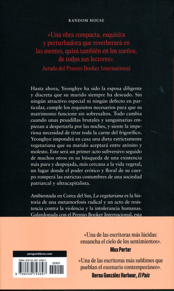Hasta ahora, Yeonghye ha sido la esposa diligente y discreta que su marido siempre ha deseado. Sin ningún atractivo especial ni ningún defecto en particular, cumple los requisitos necesarios para que su matrimonio funcione sin sobresaltos. Todo cambia cuando unas pesadillas brutales y sanguinarias empiezan a despertarla por las noches, y siente la imperiosa necesidad de deshacerse de toda la carne del frigorífico. A partir de ese momento, Yeonghye impondrá en casa una dieta exclusivamente vegetariana que su marido aceptará entre atónito y molesto. Este será un primer acto subversivo seguido de muchos otros que la llevarán a la búsqueda de una existencia más pura y despojada, más cercana a la vida vegetal, un lugar donde el poder erótico y floral de sucuerpo romperá las estrictas costumbres de una sociedad patriarcal y ultracapitalista.