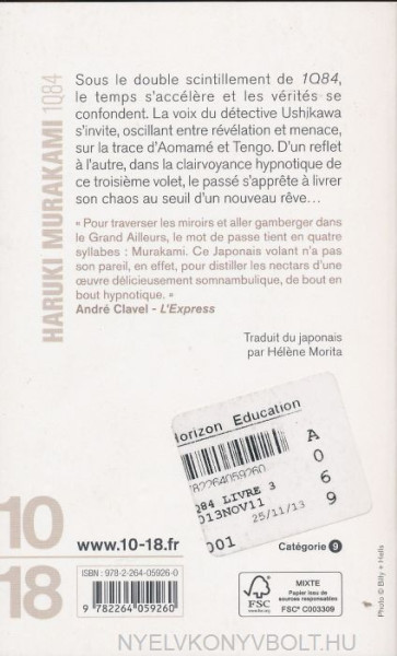 Au Japon, d’octobre a décembre 1984. Aux voix d’Aomamé et de Tengo se joint dans ce troisieme volume celle du détective Ushikawa. Enrôlé par la secte des Précurseurs, Ushikawa se lance aux trousses de la tueuse et de l’écrivain, et leve un a un les voiles sur leur passé. Sous les deux lunes de 1Q84, un complexe jeu du chat et de la souris se met en place. Pour Aomamé et Tengo, le temps est désormais compté…