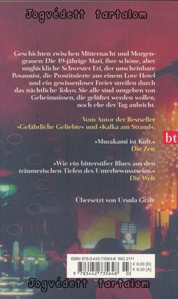 Geschichten zwischen Mitternacht und Morgengrauen: Murakami begleitet seine Helden eine Nacht lang und zeichnet ein eindrucksvolles, geheimnisvoll schillerndes Großstadtporträt: Die 19-jährige Mari, ihre schöne, aber unglückliche Schwester Eri, der unscheinbare Posaunist, die Prostituierte aus einem Love Hotel und ein gewissenloser Freier streifen durch das nächtliche Tokyo. Sie alle sind umgeben von Geheimnissen, die gelüftet werden wollen, noch ehe der Tag anbricht.