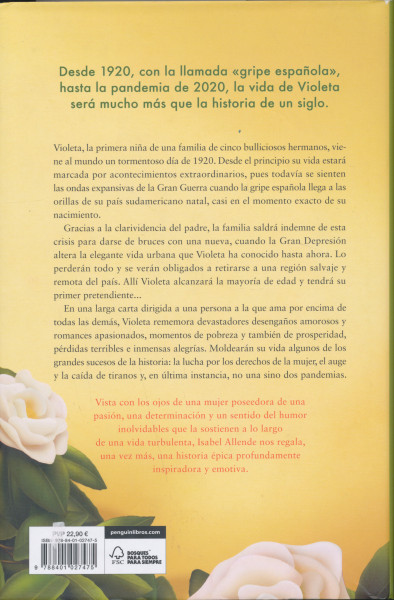 Violeta viene al mundo un tormentoso día de 1920, siendo la primera nina de una familia de cinco bulliciosos hermanos. Desde el principio su vida estará marcada por acontecimientos extraordinarios, pues todavía se sienten las ondas expansivas de la GranGuerra cuando la gripe espanola llega a las orillas de su país sudamericano natal, casi en el momento exacto de su nacimiento.Gracias a la clarividencia del padre, la familia saldrá indemne de esta crisis para darse de bruces con una nueva, cuando la Gran Depresión altera la elegante vida urbana que Violeta ha conocido hasta ahora. Su familia lo perderá todo y se verá obligada a retirarse a una región salvaje y remota del país. Allí Violeta alcanzará la mayoría de edad y tendrá su primer pretendiente...En una carta dirigida a una persona a la que ama por encima de todas las demás, Violeta rememora devastadores desenganos amorosos y romances apasionados, momentos de pobreza y también de prosperidad, pérdidas terribles e inmensas alegrías.