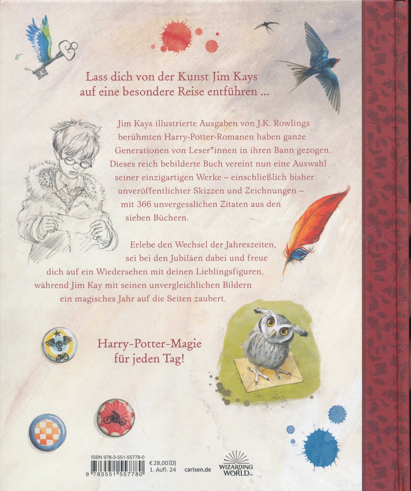 Ein magisches Jahr mit Harry Potter nimmt die Leser*innen mit auf eine zauberhafte Reise durch die Jahreszeiten. Jim Kays bildgewaltige Illustrationen, zusammen mit den berühmten Zitaten aus J.K. Rowlings heiß geliebten Romanen, erwecken die magische Welt schillernd zum Leben. Jeder Tag steht im Zeichen eines anderen Jubiläums oder einer wichtigen Erinnerung aus den Harry-Potter-Romanen.