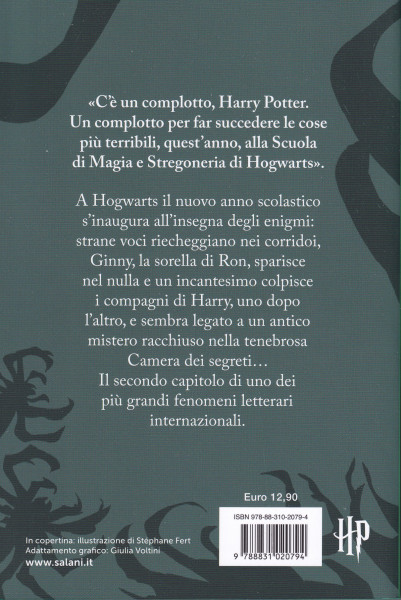 A Hogwarts il nuovo anno scolastico s’inaugura all’insegna degli enigmi: strane voci riecheggiano nei corridoi, Ginny, la sorella di Ron, sparisce nel nulla e un incantesimo colpisce i compagni di Harry, uno dopo l'altro, e sembra legato a un antico mistero racchiuso nella tenebrosa Camera dei segreti…Il secondo capitolo di uno dei piu grandi fenomeni letterari internazionali.