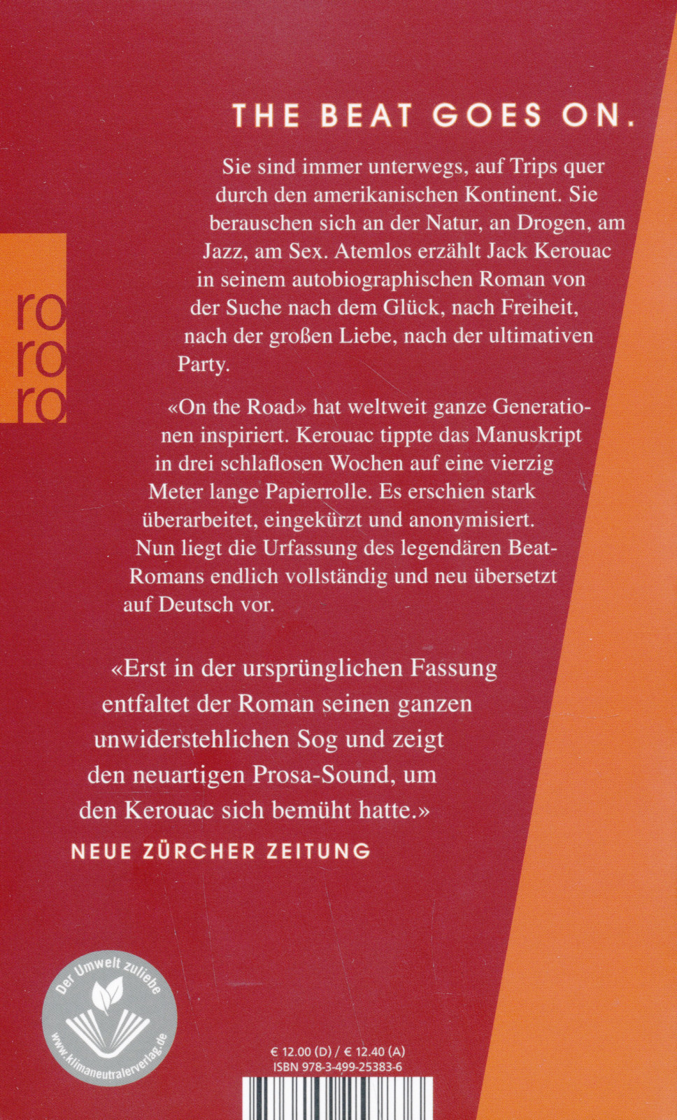 Sie sind immer unterwegs, auf Trips quer durch den amerikanischen Kontinent. Sie berauschen sich an der Natur, an Drogen, am Jazz, am Sex. Atemlos erzählt Jack Kerouac in seinem autobiographischen Roman von der Suche nach dem Glück, nach Freiheit, nach der großen Liebe, nach der ultimativen Party.«On the Road» hat weltweit ganze Generationen inspiriert. Kerouac tippte das Manuskript in drei schlaflosen Wochen auf eine vierzig Meter lange Papierrolle. Es erschien stark überarbeitet,eingekürzt und anonymisiert. Nun liegt die Urfassung des legendären Beat-Romans endlich vollständig und neu übersetzt auf Deutsch vor.