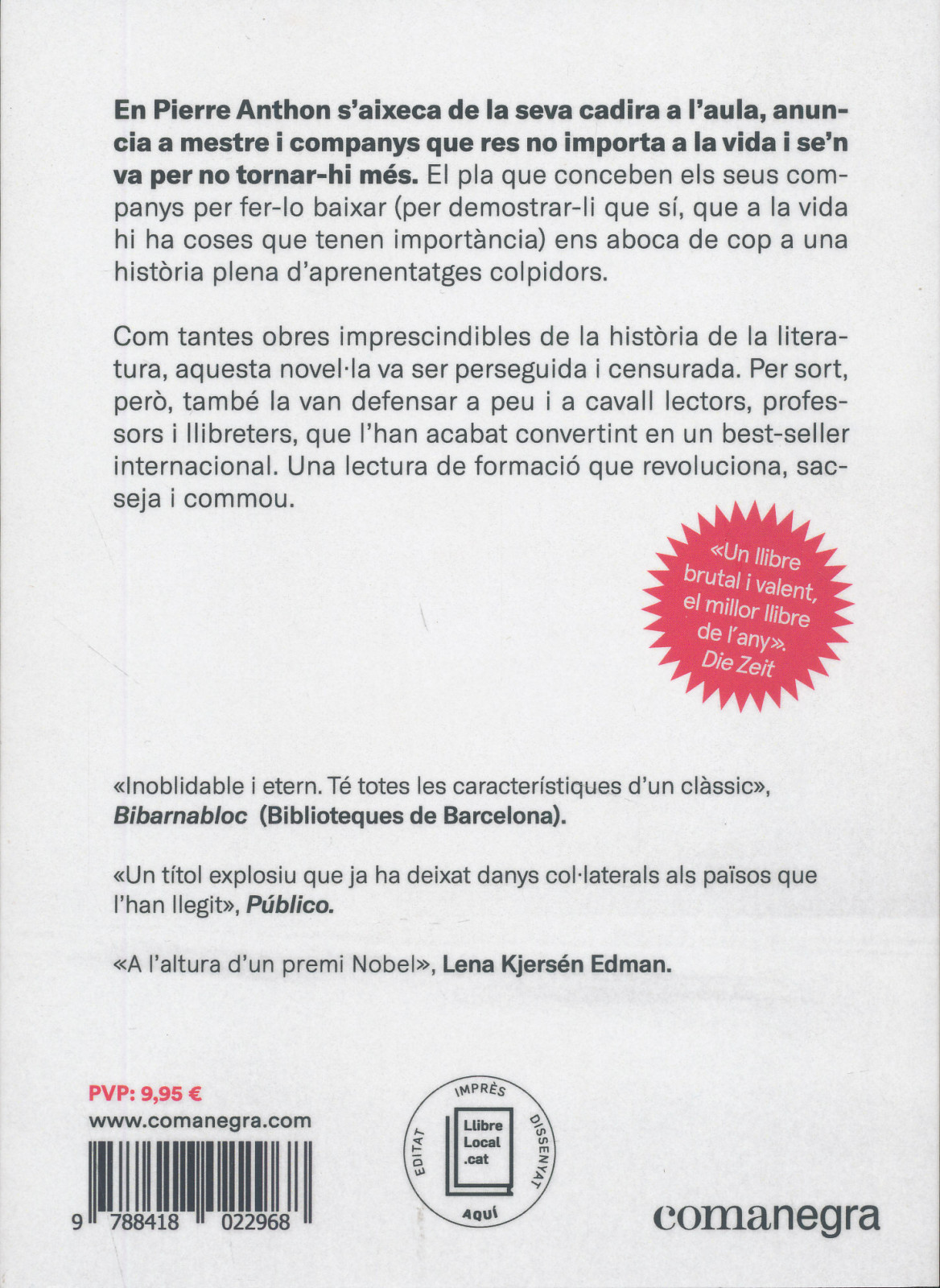 En Pierre Anthon s’aixeca de la seva cadira a l’aula, anuncia a mestre i companys que res no importa a la vida i se’n va per no tornar-hi més. El pla que conceben els seus companys per fer-lo baixar (per demostrar-li que sí, que a la vida hi ha coses que tenen importancia) ens aboca de cop a una historia que s'intueix plena d'aprenentatges colpidors. Com tantes obres imprescindibles de la historia de la literatura, aquesta novel·la va ser perseguida i censurada. Per sort, pero, també la van defensar a peu i a cavall lectors, professors i llibreters, que l'han acabat convertint en un best-seller internacional. Una lectura de formació que revoluciona, sacseja i commou