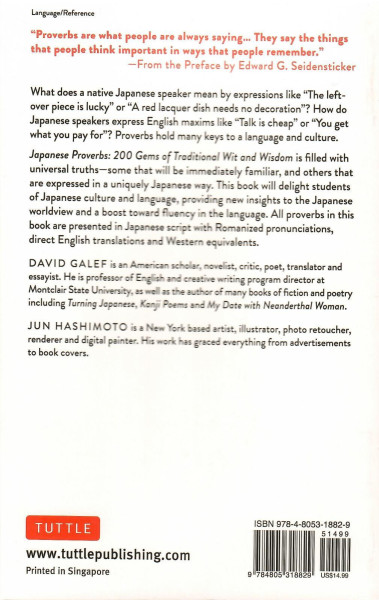 Japanese Proverbs: 200 Nuggets of Traditional Wit and Wisdom is a delightfully illustrated compilation of traditional Japanese sayings and maxims. Some of the classic Japanese quotes and quotations, like 'Fall down seven times, get up eight,' capture the dogged perseverance of the Japanese heart. Others, such as "A red lacquer dish needs no decoration" illuminate both a universal truth and Japan's unique, aesthetic traditions. Japanese Proverbs has proverbs of great cultural significance as well as proverbs on matters of daily life and customs. Pleasing to expert and new comer alike, the 200 traditional proverbs in this unique collection are presented in Japanese calligraphy form, along with direct English translations. Similar proverbs are given fromEnglish, and the sumi-e style ink drawings are a delight in their own right. Amateurs and Japanese language enthusiasts alike will speak Japanese with the verve and nuance of a native when they use these apt and witty expressions.
