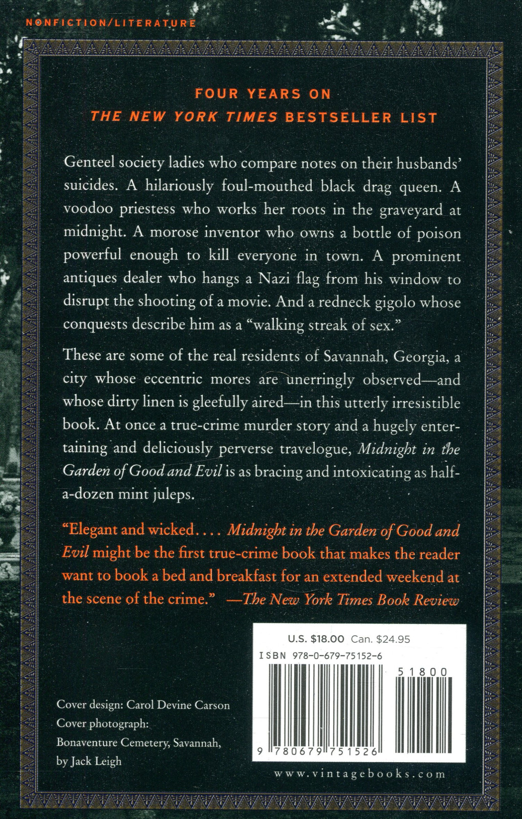For nearly a decade, the shooting and its aftermath reverberated throughout this hauntingly beautiful city of moss-hung oaks and shaded squares. John Berendt's sharply observed, suspenseful, and witty narrative reads like a thoroughly engrossing novel, and yet it is a work of nonfiction. Berendt skillfully interweaves a hugely entertaining first-person account of life in this isolated remnant of the Old South with the unpredictable twists and turns of a landmark murder case.