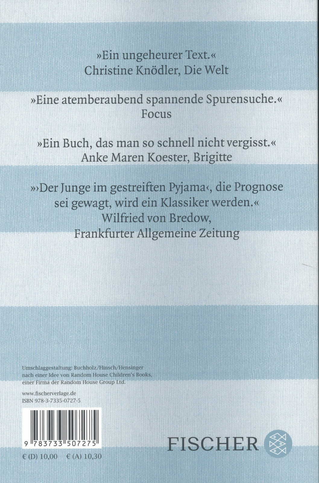Normalerweise geben wir an dieser Stelle ein paar Hinweise auf den Inhalt, aber bei diesem Buch - so glauben wir - ist es besser, wenn man vorher nicht weiß, worum es geht. Wer zu lesen beginnt, begibt sich auf eine Reise mit einem neunjährigen Jungen namens Bruno. (Und doch ist es kein Buch für Neunjährige.) Früher oder später kommt er mit Bruno an einen Zaun. Zäune wie dieser existieren auf der ganzen Welt.