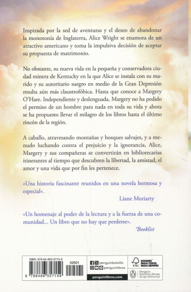 Inspirada por la sed de aventuras y el deseo de abandonar la monotonía de Inglaterra, Alice Wright se enamora de un atractivo americano y toma la impulsiva decisión de aceptar su propuesta de matrimonio.Pero su nueva vida en la pequena y conservadora ciudad minera de Kentucky en la que Alice se instala con su marido y su autoritario suegro en medio de la Gran Depresión resulta aún más claustrofóbica. Hasta que conoce a Margery O'Hare. Independiente y deslenguada, Margery no ha pedido el permiso de un hombre para nada en toda su vida y ahora se ha propuesto llevar el milagro de los libros hasta el último rincón de la región.A caballo, atravesando montanas y bosques salvajes, y a menudo luchando contra el prejuicio y la ignorancia, Alice, Margery y sus companeras se convertirán en bibliotecarias itinerantes al tiempo que descubren la libertad, la amistad, el amor y una vida que por fin les pertenece.