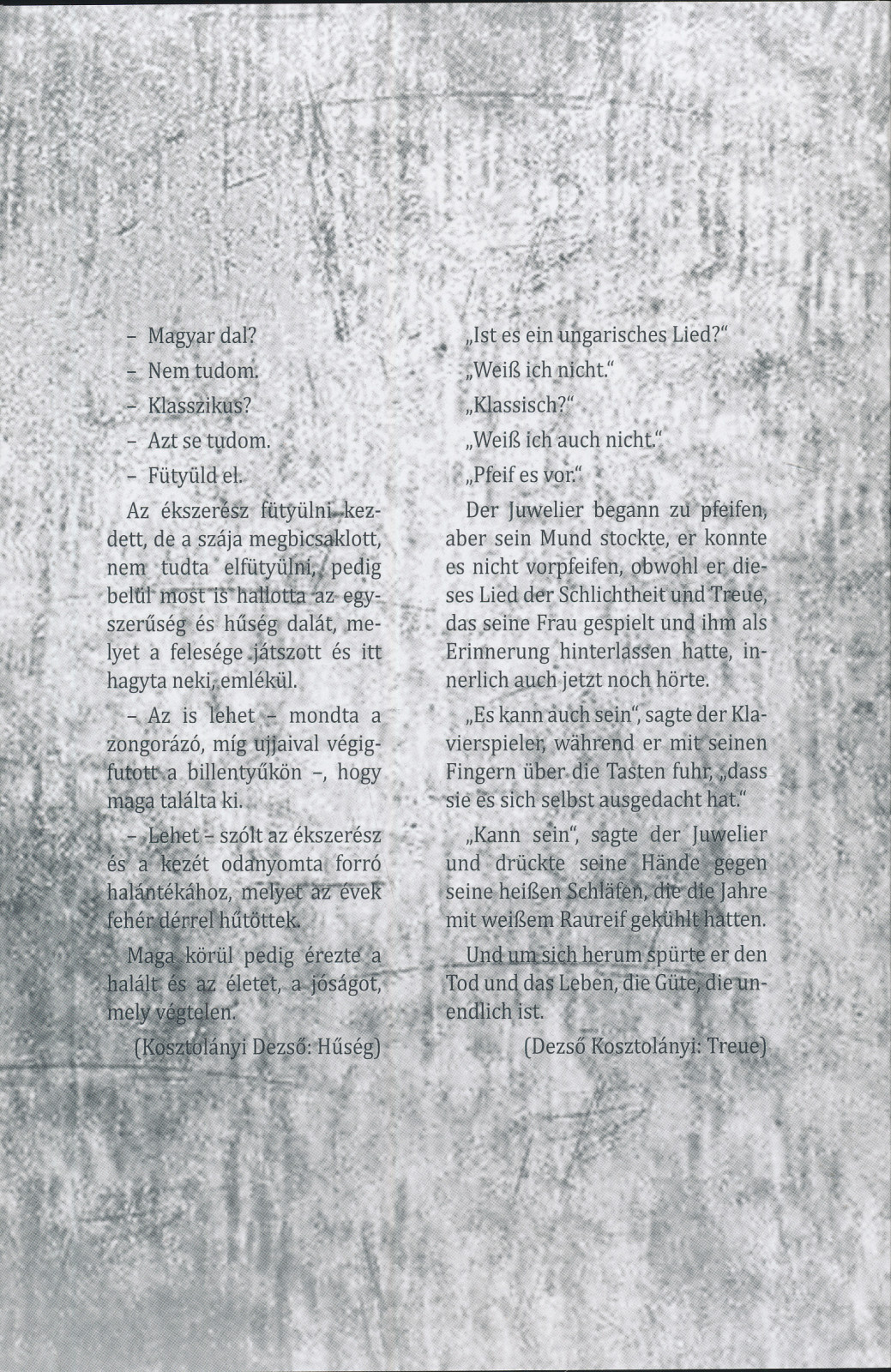 A kötet kétnyelvűsége nemcsak tanulmányi szempontból izgalmas, hanem irodalmi kaland is: a magyar eredeti és a német fordítás egymás mellett haladva párbeszédet folytat. Ez a párbeszéd nemcsak nyelvek között, hanem kultúrák, generációk és értelmezések között is zajlik. A válogatás különösen emlékezetes darabjai - mint az Ezüstbot vagy a Legenda - fájdalmasan szép történetek veszteségről, az emlékezés hatalmáról, az élet és halál határvonaláról. Kosztolányi szuggesztív képei és finom iróniája a mai olvasókat is mélyen megérintik. Ez a kötet nem csupán egy irodalmi élmény: tisztelgés Kosztolányi emberi mélységei és nyelvi zsenialitása előtt, és egyúttal egy új olvasói közösség megszületésének tanúja - a hűség jegyében.