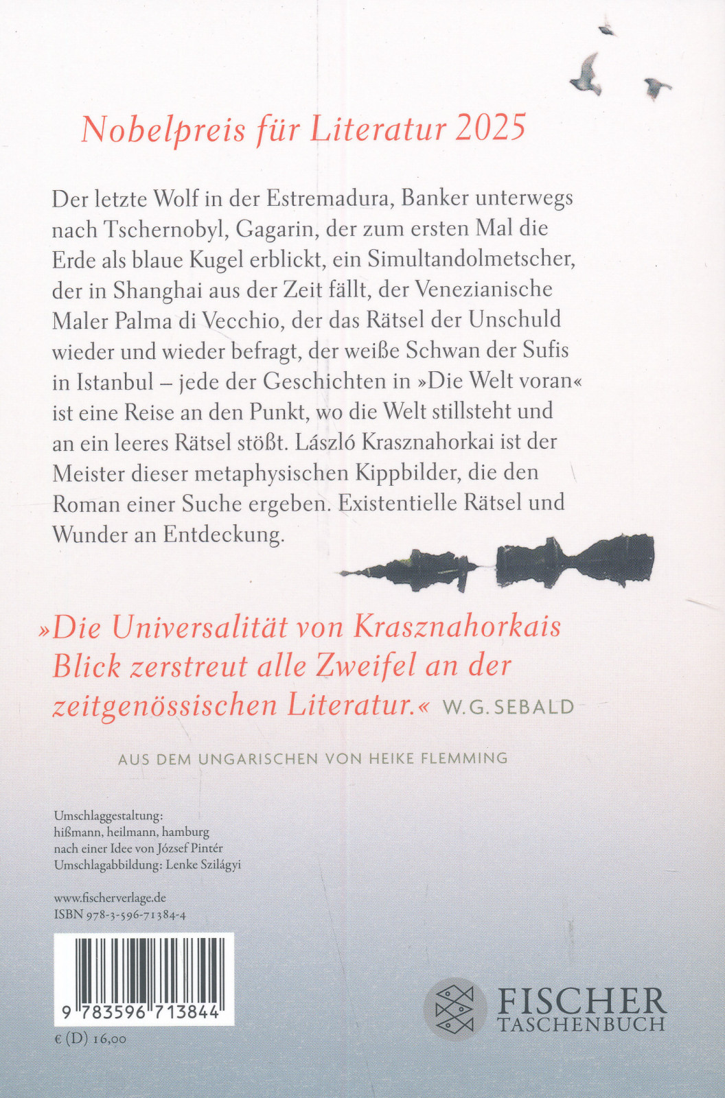 In seinem Werk, das im Moment eine aufsehenerregende Rezeption im angelsächsischen Raum erfährt, wird eine so betörend luzide wie düstere Karte unserer Gegenwart gezeichnet. Das leuchtende Dunkel Becketts, in dem er sich mit Kafkas Kompass bewegt, steht auch hinter den Erzählungen in 'Die Welt voran', das durch die Musikalität seiner Sprache und die Eindringlichkeit seiner Bilder zur Widerspiegelung einer beinah geretteten Welt wird.'Die Universalität von Krasznahorkais Blick zerstreut alle Zweifel an der zeitgenössischen Literatur.' W. G. Sebald