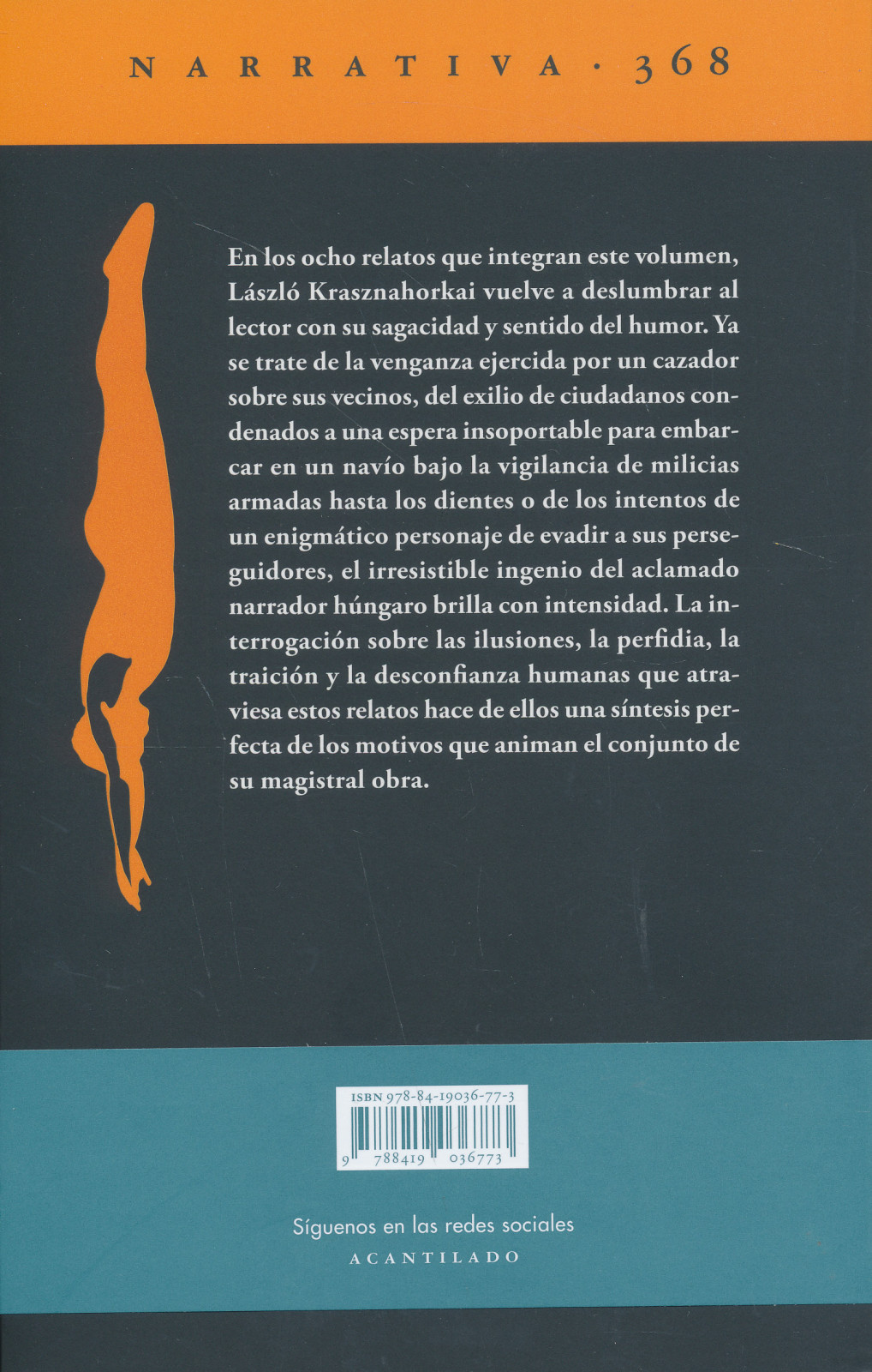 En los ocho relatos que integran este volumen, László Krasznahorkai vuelve a deslumbrar al lector con su sagacidad y sentido del humor. Ya se trate de la venganza ejercida por un cazador sobre sus vecinos, del exilio de ciudadanos condenados a una espera insoportable para embarcar en un navío bajo la vigilancia de milicias armadas hasta los dientes o de los intentos de un enigmático personaje de evadir a sus perseguidores, el irresistible ingenio del aclamado narrador húngaro brilla con intensidad. La interrogación sobre las ilusiones, la perfidia, la traición y la desconfianza humanas que atraviesa estos relatos hace de ellos una síntesis perfecta de los motivos que animan el conjunto de su magistral obra.