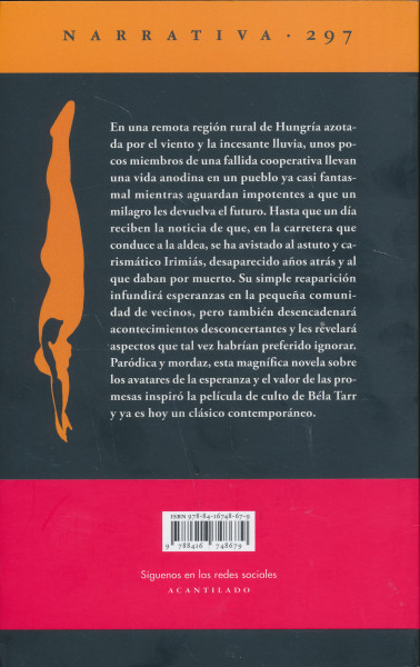 Poco después de la caída del régimen comunista, en una remota región rural de Hungría azotada por el viento y la incesante lluvia, unos pocos miembros de una fallida cooperativa agrícola llevan una vida anodina en un pueblo ya casi fantasmal mientras aguardan impotentes a que un milagro les devuelva el futuro. Hasta que un día reciben la noticia de que, en la carretera que conduce a la aldea, se ha avistado al astuto y carismático Irimiás, desaparecido anos atrás y al que daban por muerto. Su simple reaparición infundirá esperanzas en la pequena comunidad de vecinos, pero también desencadenará acontecimientos desconcertantes y les revelará aspectos que tal vez habrían preferido ignorar. Paródica y mordaz, esta magnífica novela sobre los avatares de laesperanza y el valor de las promesas inspiró la película de culto de Béla Tarr y ya es hoy un clásico contemporáneo.