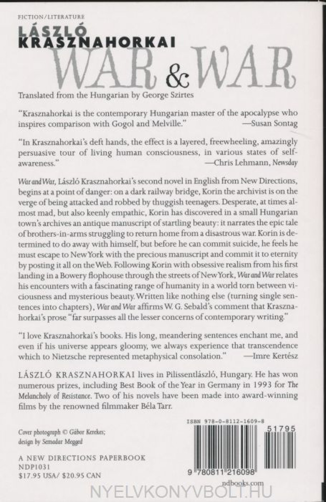Desperate, at times almost mad, but also keenly empathic, Korim has discovered in a small Hungarian town's archives an antique manuscript of startling beauty: it narrates the epic tale of brothers-in-arms struggling to return home from a disastrous war.Korim is determined to do away with himself, but before he can commit suicide, he feels he must escape to New York with the precious manuscript and commit it to eternity by typing it all on the world-wide web. Following Korim with obsessive realism through the streets of New York (from his landing in a Bowery flophouse to his moving far uptown with a mad interpreter), War and War relates his encounters with a fascinating range of humanity, a world torn between viciousness and mysterious beauty. Following the eight chapters of War and War is a short "prequel acting as a sequel," "Isaiah," which brings us to a dark bar, years before in Hungary, where Korim rants against the world and threatens suicide.