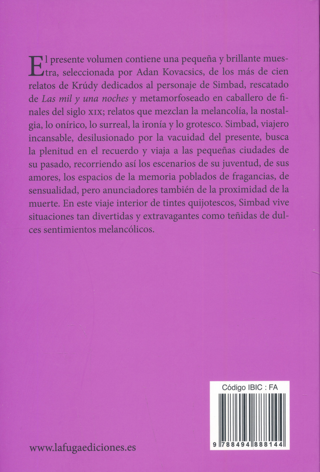 El presente volumen contiene una pequena muestra, seleccionada por Adan Kovacsics, traductor galardonado con el Premio Nacional a la Mejor Traducción y a la Obra de un Traductor, de los más de cien relatos de Krúdy dedicados al personaje de Simbad surgido de "Las mil y una noches" y metamorfoseado en caballero de finales del siglo XIX; relatos que mezclan la melancolía, la nostalgia, lo onírico, lo surreal, la ironía, lo grotesco. Simbad, viajero incansable, desilusionado por la vacuidad del presente, busca la plenitud en el recuerdo, viaja a las pequenas ciudades de su pasado, recorre los escenarios de su juventud, de sus amores, los espacios de la memoria poblados de fragancias, de sensualidad, pero también de proximidad a la muerte.
