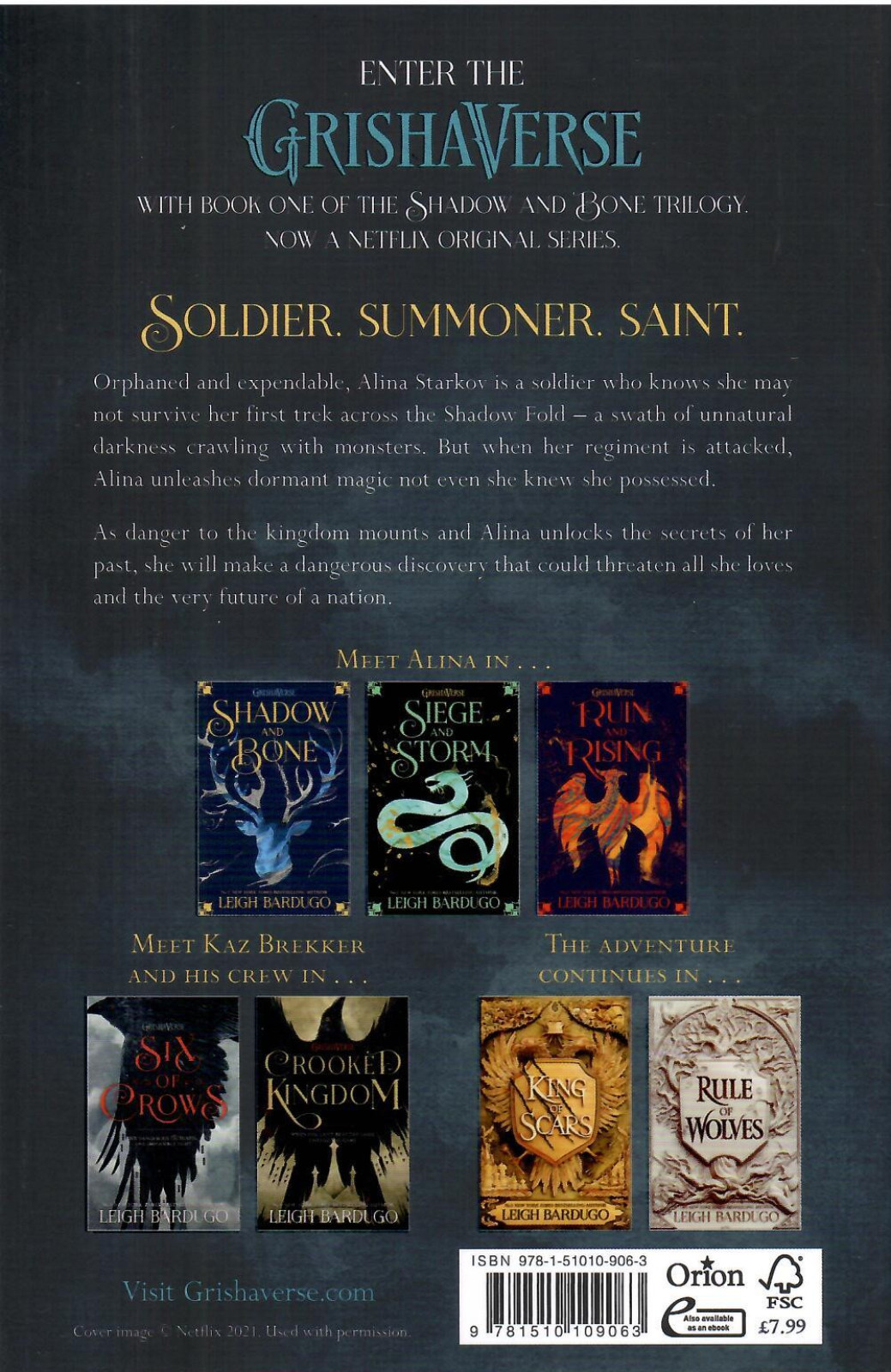 Soldier. Summoner. Saint. Orphaned and expendable, Alina Starkov is a soldier who knows she may not survive her first trek across the Shadow Fold - a swath of unnatural darkness crawling with monsters. But when her regiment is attacked, Alina unleashes dormant magic not even she knew she possessed.Now Alina will enter a lavish world of royalty and intrigue as she trains with the Grisha, her country's magical military elite - and falls under the spell of their notorious leader, the Darkling. He believes Alina can summon a force capable of destroying the Shadow Fold and reuniting their war-ravaged country, but only if she can master her untamed gift.