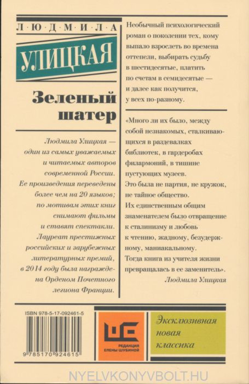 Ljudmilu Ulitskuju ne raz nazyvali ochen vnimatelnym svidetelem epokhi, ee tsepkim nabljudatelem i interpretatorom. Pozhaluj, bolee vsego eto otnositsja k romanu "Zelenyj shater".