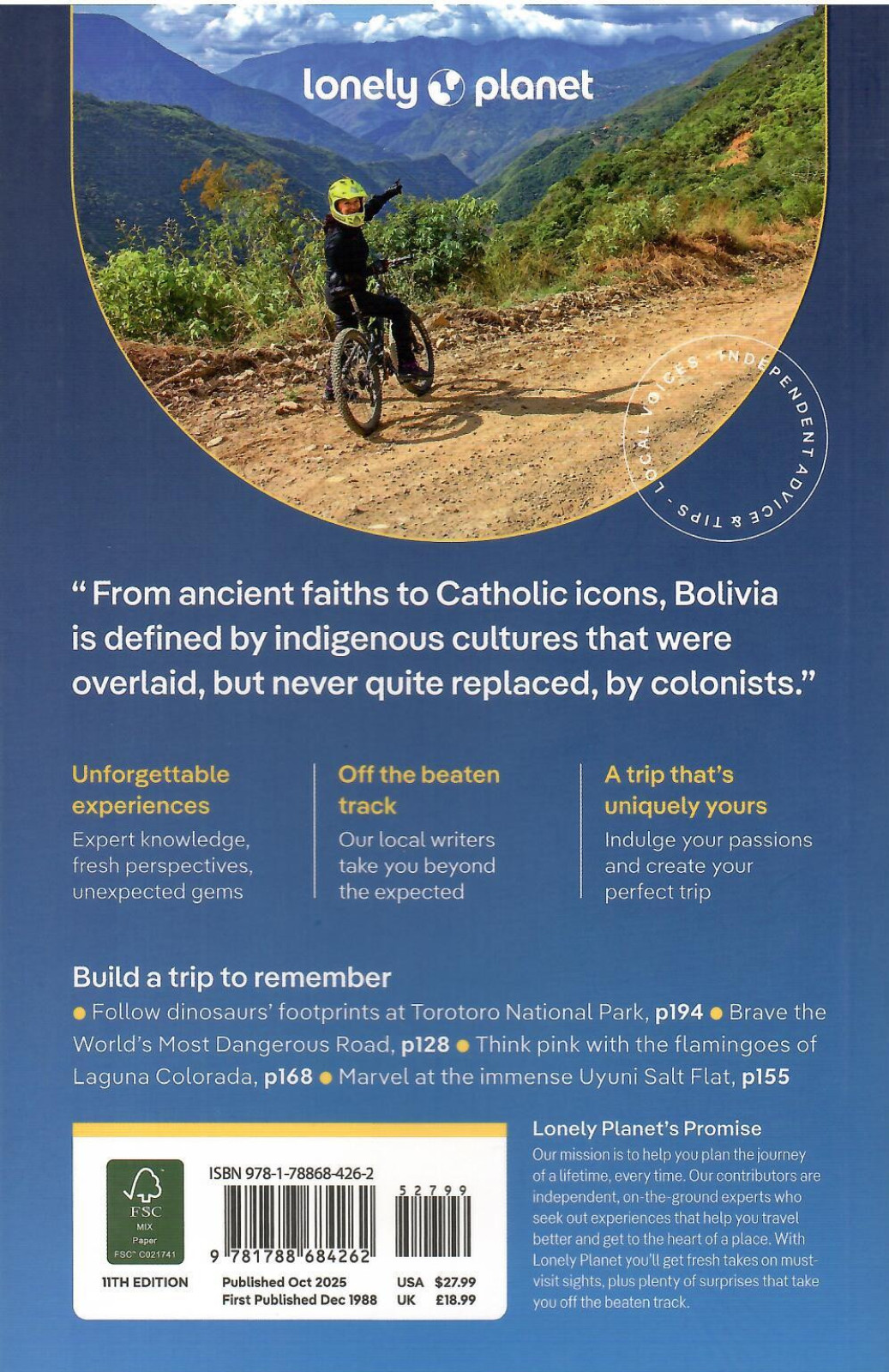Discover Bolivia's most popular experiences and best kept secrets from communing with tortoises and sloths at Santa Cruz's Jardín Botánico; to adjusting your eyes to Salar de Uyuni's stunning salt flat, the largest in the world; and finding true religion at Misiones de Chiquitos Baroque Music Festival.Build a trip to remember with Lonely Planet's Bolivia travel guide:Our classic guidebook format contains the most comprehensive level of information for planning multi-week tripsAll-new structure and design that's easy to use so you can navigate Bolivia effortlesslyExciting itineraries help you create your perfect adventure with suggestions for extended journeys, day trips, walking tours and activity-led excursionsExpert local recommendations on eating, drinking, nightlife, shopping, accommodation, festivals, when to go and moreVibrant photography and maps Get fresh takes on must-visit sights from Tiwanaku to Chincana Ruins and Cerro Rico