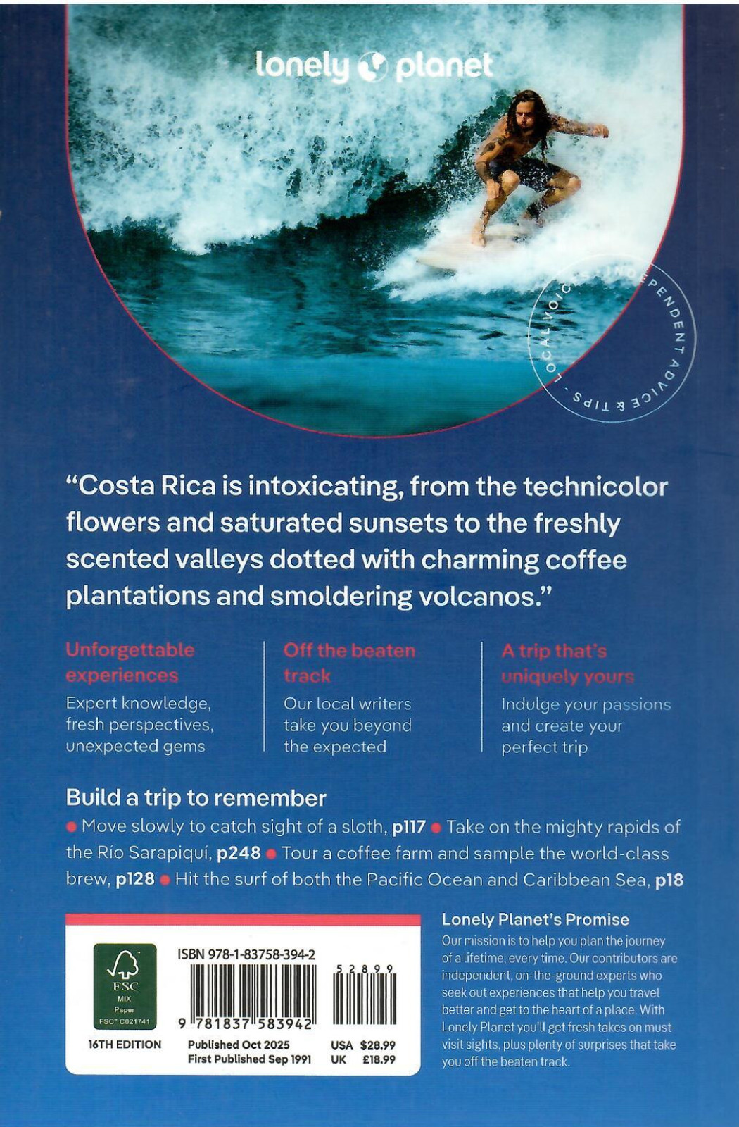 Discover Costa Rica's most popular experiences and best kept secrets from catching a glimpse of shy sloths and white-faced monkeys in Parque Nacional Manuel Antonio; to marvelling at the five scenic cascades in the Central Valley's La Paz Waterfall Gardens; and taking an educational bean-to-bar cacao tour at an organic farm in Río Celeste.Build a trip to remember with Lonely Planet's Costa Rica travel guide:Our classic guidebook format contains the most comprehensive level of information for planning multi-week tripsAll-new structure and design that's easy to use so you can navigate Costa Rica effortlesslyExciting itineraries help you create your perfect adventure with suggestions for extended journeys, day trips, walking tours and activity-led excursionsExpert local recommendations on eating, drinking, nightlife, shopping, accommodation, festivals, when to go and moreVibrant photography and maps