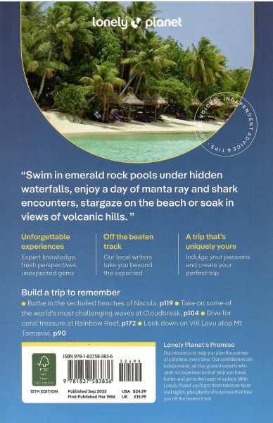 Discover Fiji's most popular experiences and best kept secrets from exploring secluded beaches on the distant islet of Nacula; to visiting the limestone caves of Sawa-i-Lau, a jaw-dropping testament to the artistic powers of the ocean; and scaling the volcanic plus of Vatuvula, looming above the island of Wayasewa.Build a trip to remember with Lonely Planet's Fiji travel guide:Our classic guidebook format contains the most comprehensive level of information for planning multi-week tripsAll-new structure and design that's easy to use so you can navigate Fiji effortlesslyExciting itineraries help you create your perfect adventure with suggestions for extended journeys, day trips, walking tours and activity-led excursionsExpert local recommendations on eating, drinking, nightlife, shopping, accommodation, festivals, when to go and moreVibrant photography and maps including a pull-out map of FijiGet fresh takes on must-visit sights from Beqa to Rainbow Reef and the Mamanucas