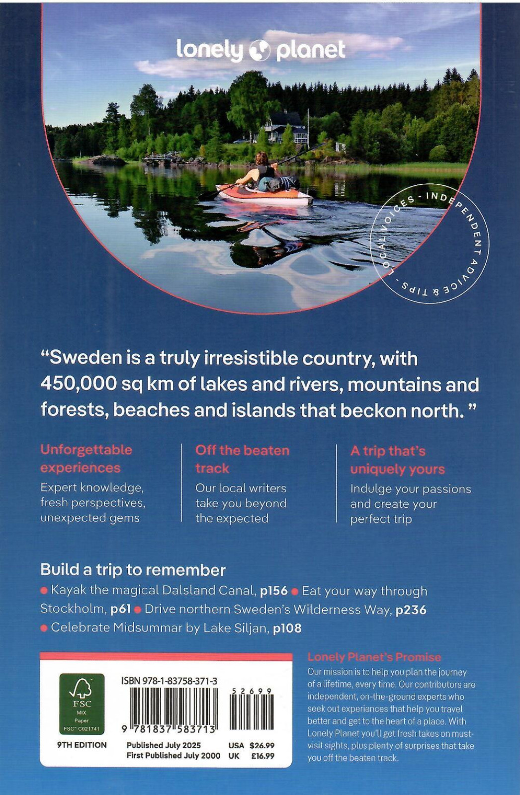 Discover Sweden's most popular experiences and best kept secrets from taking part in reindeer races at Jokkmokk's Sámi Winter Market, to embarking on a ghost hunt at the haunted medieval stronghold of Glimmingehus, and taking a boat to the less-trodden Padjelantaleden where beautiful hikes past pristine lakes and mountains await.Build a trip to remember with Lonely Planet's Sweden travel guide:Our classic guidebook format contains the most comprehensive level of information for planning multi-week tripsAll-new structure and design that's easy to use so you can navigate Sweden effortlesslyExciting itineraries help you create your perfect adventure with suggestions for extended journeys, day trips, walking tours and activity-led excursionsExpert local recommendations on eating, drinking, nightlife, shopping, accommodation, festivals, when to go and moreVibrant photography and maps including a pull-out map of Stockholm