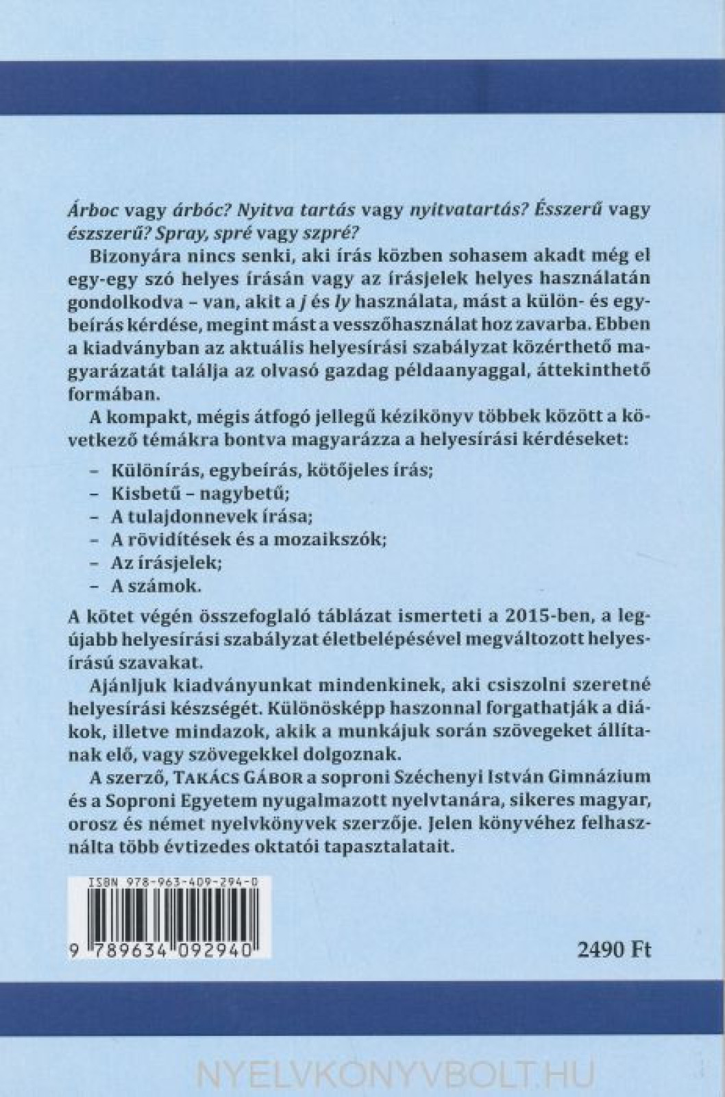 A kompakt, mégis átfogó jellegű kézikönyv többek között a következő témákra bontva magyarázza a helyesírási kérdéseket: – Különírás, egybeírás, kötőjeles írás;– Kisbetű – nagybetű;– A tulajdonnevek írása;– A rövidítések és a mozaikszók;– Az írásjelek;– A számok. A kötet végén összefoglaló táblázat ismerteti a 2015-ben, a legújabb helyesírási szabályzat életbelépésével megváltozott helyesírású szavakat.Ajánljuk kiadványunkat mindenkinek, aki csiszolni szeretné helyesírási készségét. Különösképp haszonnal forgathatják a diákok, illetve mindazok, akik a munkájuk során szövegeket állítanak elő, vagy szövegekkel dolgoznak.