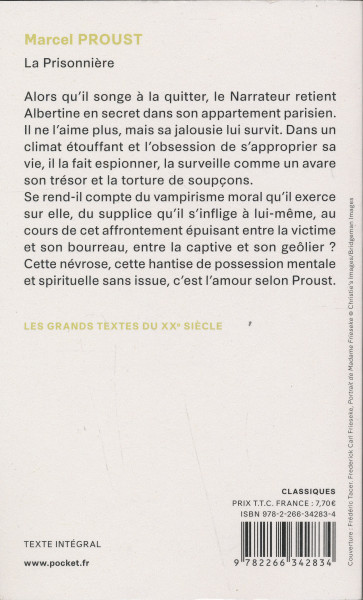 Alors qu'il songe a la quitter, le Narrateur retient Albertine en secret dans son appartement parisien.Il ne l'aime plus, mais sa jalousie lui survit. Dans un climat étouffant et l'obsession de s'approprier sa vie, il la fait espionner, la surveille comme un avare son trésor et la torture de soupçons.Se rend-il compte du vampirisme moral qu'il exerce sur elle, du supplice qu'il s'inflige a lui-meme, au cours de cet affrontement épuisant entre la victime et son bourreau, entre la captive et son geôlier ?Cette névrose, cette hantise de possession mentale et spirituelle sans issue, c'est l'amour selon Proust.