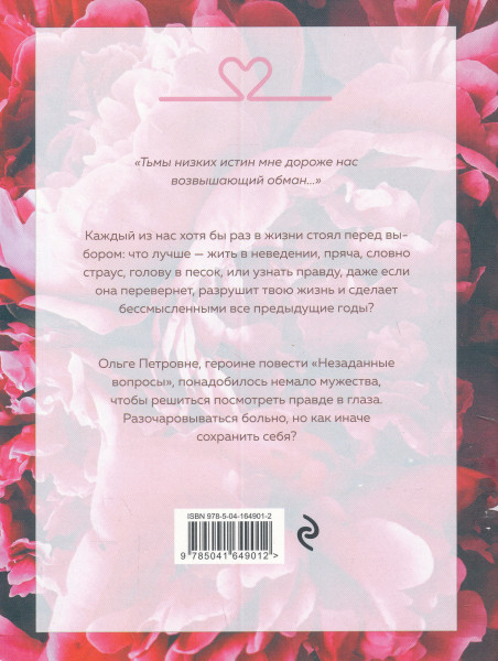 Obychnye ljudi mne interesnee oligarkhov ili, skazhem, bogemy. Ja ved tozhe - samyj chto ni na est obychnyj chelovek. Zhivu takoj zhe zhiznju, chto i vy. Ja tozhe zhena, mama i babushka, - govorit Marija. I v etom - odin iz sekretov ee uspekha. Ee rasskazy primirjajut s trudnostjami i dajut nadezhdu na schaste. "Tmy nizkikh istin mne dorozhe nas vozvyshajuschij obman..." Kazhdyj iz nas khotja by raz v zhizni stojal pered vyborom: chto luchshe - zhit v nevedenii, prjacha, slovno straus, golovu v pesok, ili uznat pravdu, dazhe esli ona perevernet, razrushit tvoju zhizn i sdelaet bessmyslennymi vse predyduschie gody? Olge Petrovne, geroine povesti "Nezadannye voprosy", ponadobilos nemalo muzhestva, chtoby reshitsja posmotret pravde v glaza. Razocharovyvatsja bolno, no kak inache sokhranit sebja? Krome povesti "Nezadannye voprosy" v sbornik voshlo esche sem rasskazov: "Alushta", "Adusja", "Zhenschiny, kot i sobaka", "Sharfik ot Jamamoto" i drugie. Eto samostojatelnye proizvedenija, kotorye mozhno chitat
