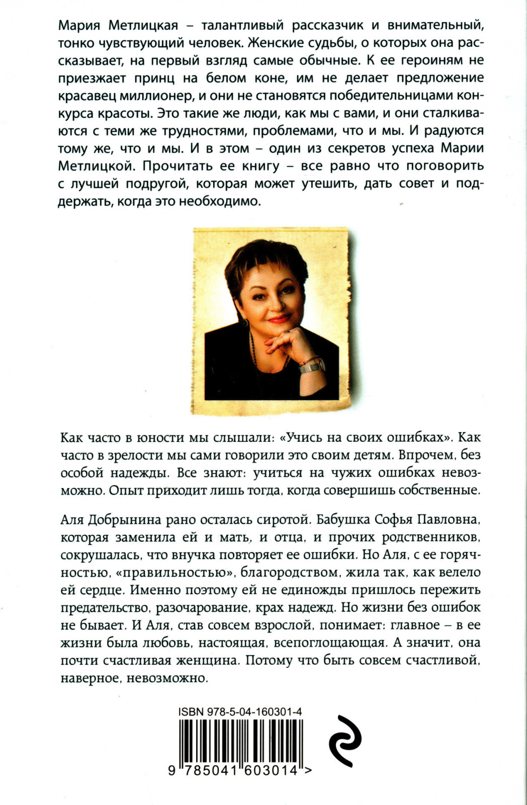 Babushka Sofja Pavlovna, kotoraja zamenila ej i mat, i ottsa, i prochikh rodstvennikov, sokrushalas, chto vnuchka bukvalno povtorjaet ee oshibki, slovno povtorjaet neprojdennoe. No Alja, s ee gorjachnostju, "pravilnostju", blagorodstvom, zhila tak, kak velelo ej serdtse. Imenno poetomu ej ne odnazhdy prishlos perezhit predatelstvo, razocharovanie, krakh nadezhd. No zhizni bez oshibok ne byvaet. I Alja, stav sovsem vzrosloj, ponimaet: glavnoe - v ee zhizni byla ljubov, nastojaschaja, vsepogloschajuschaja. A znachit, ona pochti schastlivaja zhenschina. Potomu chto byt sovsem schastlivoj, navernoe, nevozmozhno.
