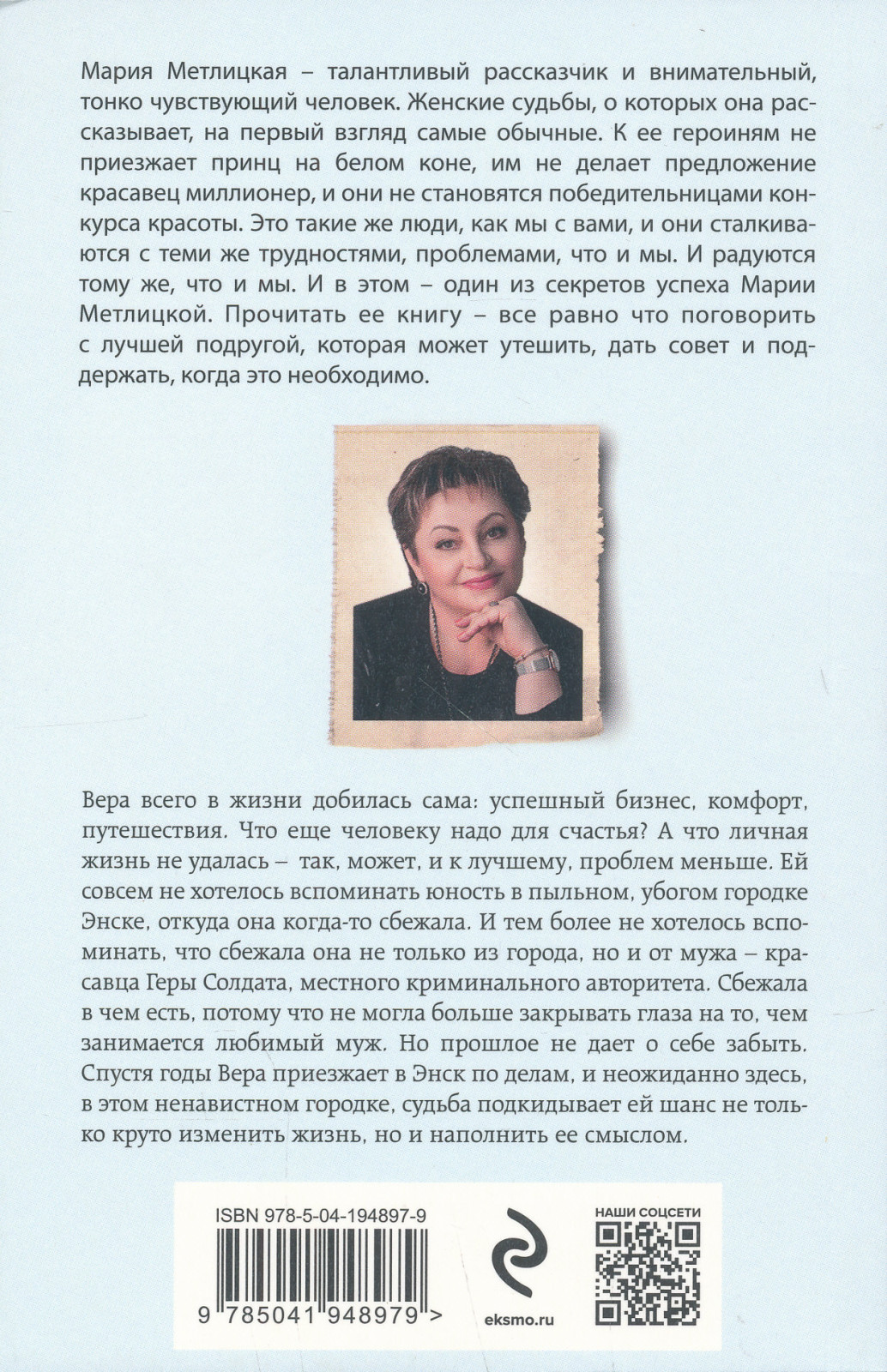 I ej tochno tak zhe khochetsja vyt volkom. Neozhidanno sudba, slovno podslushav ee mysli, delaet krutoj povorot - otpravljaet ee v Ensk, ubogij, nischij gorodishko, gde proshlo ee detstvo i junost i otkuda ona sbezhala, ostaviv vse: sytuju zhizn, trjapki, ukrashenija i - muzha. Krasavtsa Geru Soldata, mestnogo kriminalnogo avtoriteta. No proshloe ne daet o sebe zabyt. Spustja gody Vera priezzhaet v Ensk po delam, i neozhidanno zdes, v etom nenavistnom gorodke, sudba podkidyvaet ej shans ne tolko kruto izmenit zhizn, no i napolnit ee smyslom.