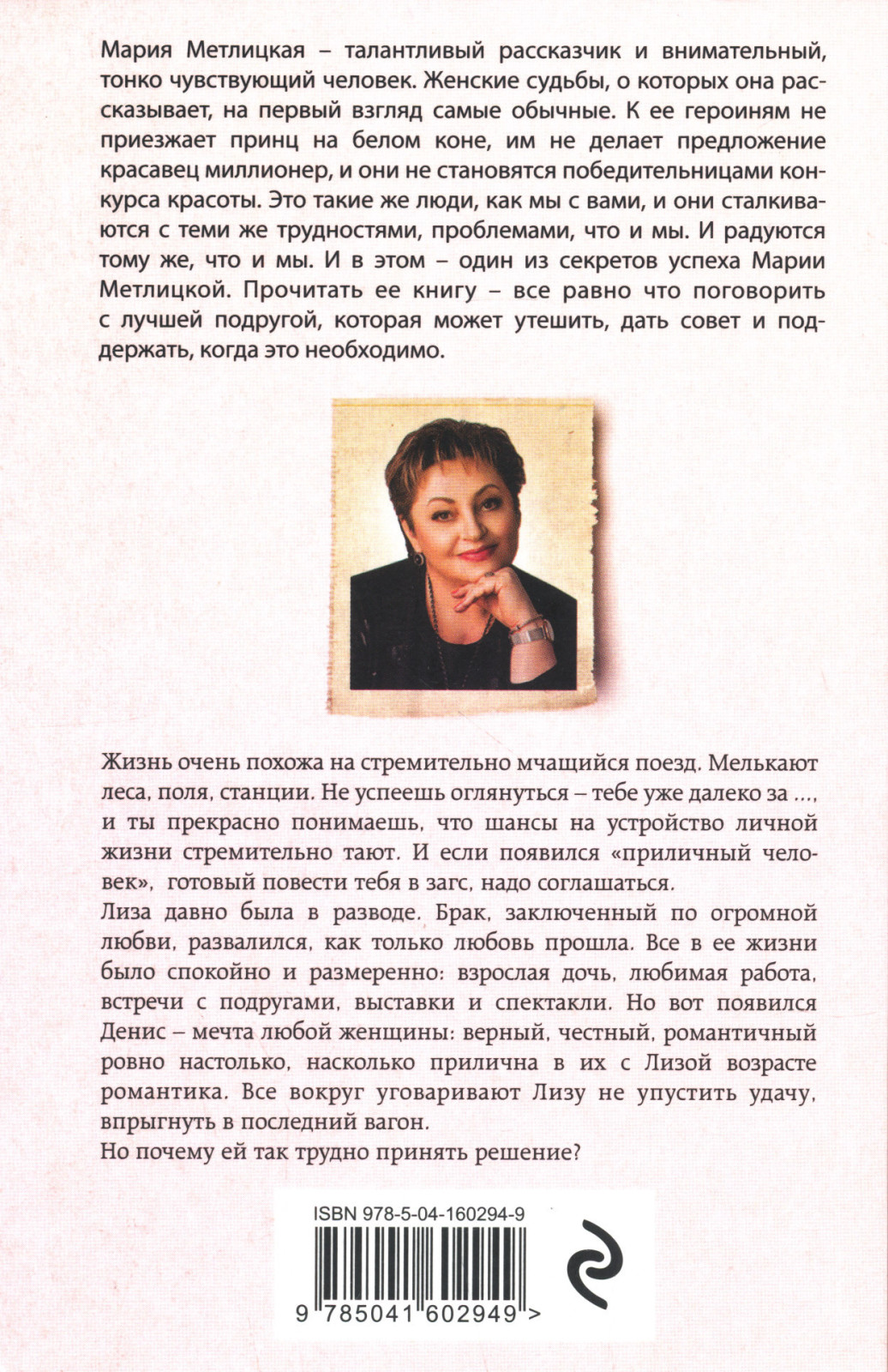 Brak, zakljuchennyj po ogromnoj ljubvi, razvalilsja, kak tolko ljubov proshla. Vse v ee zhizni bylo spokojno i razmerenno: vzroslaja doch, ljubimaja rabota, vstrechi s podrugami, vystavki i spektakli. No vot pojavilsja Denis - mechta ljuboj zhenschiny: vernyj, chestnyj, romantichnyj rovno nastolko, naskolko prilichna v ikh s Lizoj vozraste romantika. Vse vokrug ugovarivajut Lizu ne upustit udachu, vprygnut v poslednij vagon. No pochemu ej tak trudno prinjat reshenie?