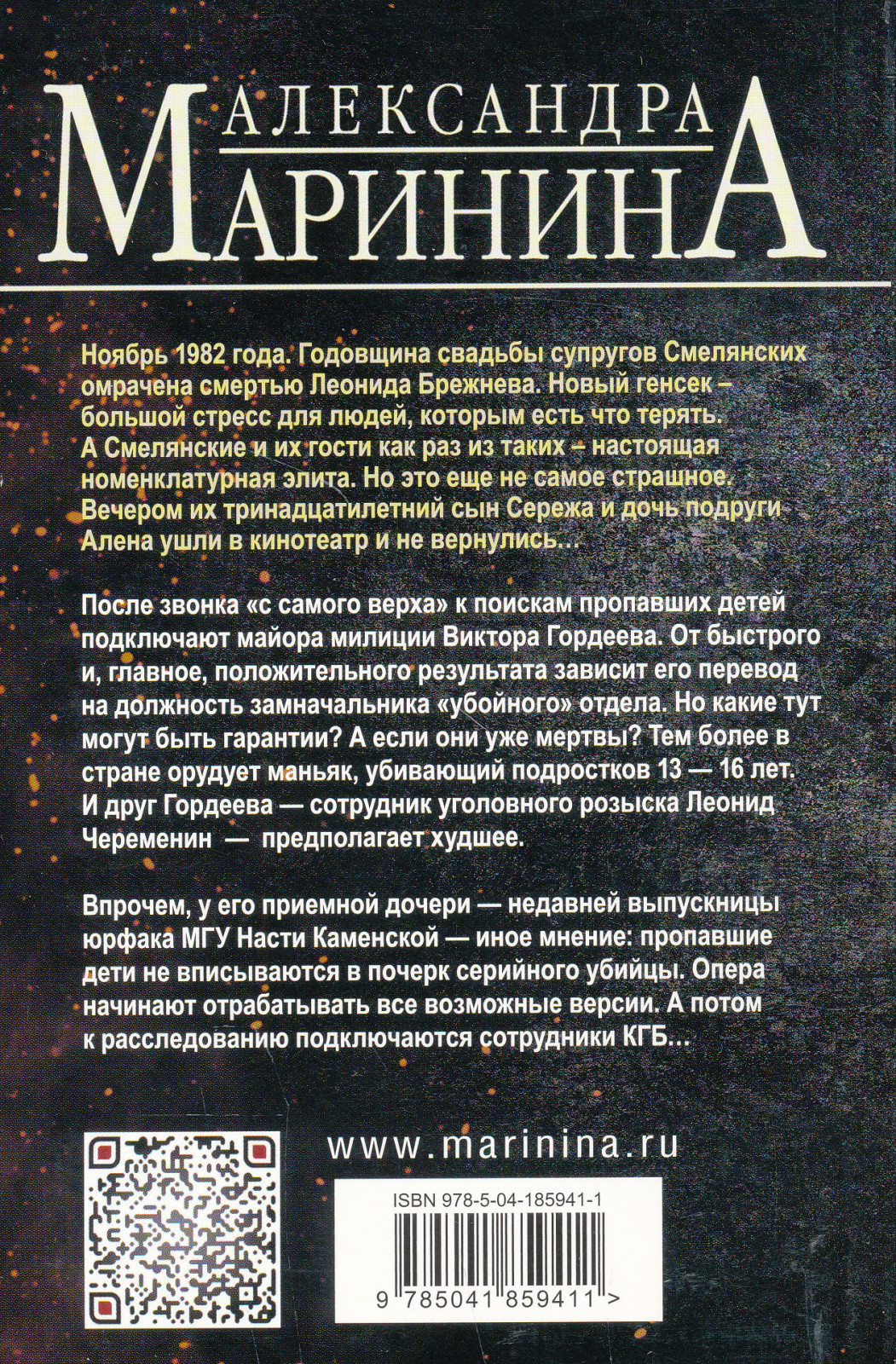 Novyj gensek - bolshoj stress dlja ljudej, kotorym est chto terjat. A Smeljanskie i ikh gosti kak raz iz takikh - nastojaschaja nomenklaturnaja elita. No eto esche ne samoe strashnoe. Vecherom ikh trinadtsatiletnij syn Serezha i doch podrugi Alena ushliv kinoteatr i ne vernulis... Posle zvonka "s samogo verkha" k poiskam propavshikh detej podkljuchajut majora militsii Viktora Gordeeva. Ot bystrogo i, glavnoe, polozhitelnogo rezultata zavisit ego perevod na dolzhnost zamnachalnika "ubojnogo" otdela. Nokakie tut mogut byt garantii? A esli oni uzhe mertvy? Tem bolee, v strane oruduet manjak, ubivajuschij podrostkov 13-16 let. I drug Gordeeva - sotrudnik ugolovnogo rozyska Leonid Cheremenin - predpolagaet khudshee. Vprochem, u ego priemnoj docheri - nedavnej vypusknitsy jurfaka MGU Nasti Kamenskoj - inoe mnenie: propavshie deti ne vpisyvajutsja v pocherk serijnogo ubijtsy. Opera nachinajut otrabatyvat vse vozmozhnye versii. A potom k rassledovaniju podkljuchajutsja sotrudniki KGB...