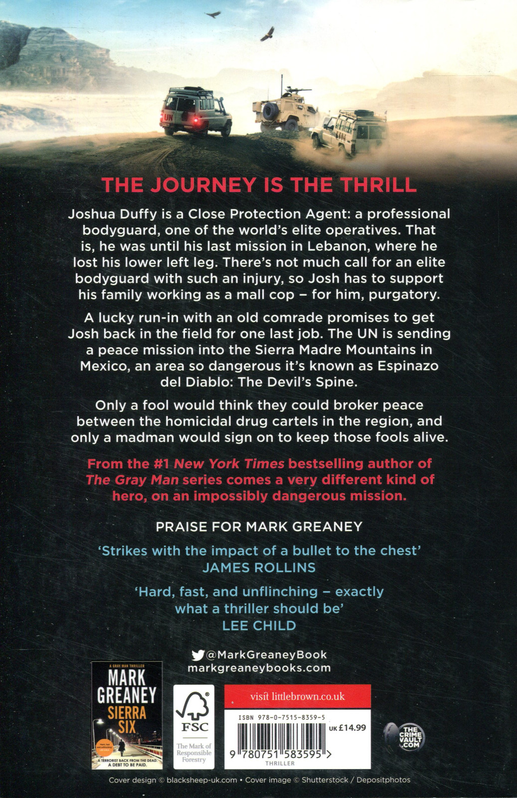 Josh lost his lower left leg. There's not much call for an elite bodyguard with such an injury. So, Josh has to support his family working as a mall cop in Jersey. For a man like Josh this is purgatory on earth, but even in Paramus miracles occur.A lucky run in with an old comrade promises to get Josh back in the field for one last job. The UN is sending a peace mission into the Sierra Madre Mountains in Mexico, an area so dangerous it's known as Espinazo del Diablo (The Devil's Spine). Only a foolwould think they could broker peace between the homicidal drug cartels in the region and only a madman would sign on to keep those fools alive.