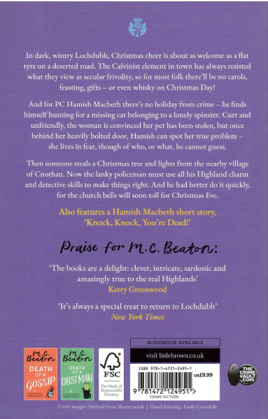 The Calvinist element in town has always resisted what they view as secular frivolity, so for most of the townsfolk there'll be no carols, feasting, gifts - or even whisky on Christmas Day!And for PC Hamish Macbeth there's no holiday from crime - hefinds himself hunting for a missing cat belonging to a lonely spinster. Curt and unfriendly, the woman is convinced her pet has been stolen but once behind her heavily-bolted door, Hamish can spot her true problem - she lives in fear, though of who or what he cannot guess.Then someone steals a Christmas tree and lights from the nearby village of Cnothan. So it is up to Hamish to sort all these problems out - and he had better do it quickly, for the church bells will soon peal on the eve of Christmas.