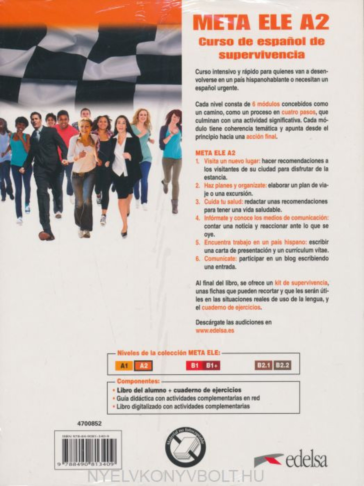 META ELE A2 es un curso intensivo de espanol lengua extranjeras para jóvenes y adultos. Incluye, en un solo tomo, el libro del alumno y el libro de ejercicios. Libro del alumno: consta 6 módulos concebidos como un camino, como un proceso en cuatro pasosde aprendizaje eminentemente prácticos que finalizan en una acción. Al final del libro, se ofrece un kit de supervivencia: fichas recortables con el vocabulario y los recursos imprescindibles para abordar una situación comunicativa. Cuaderno de ejercicios: actividades de repaso, práctica y ampliación.