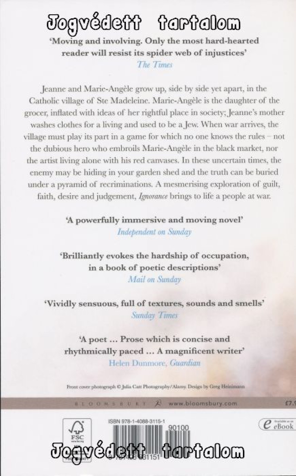 Jeanne's mother washes clothes for a living and used to be a Jew. When war arrives, the village must play its part in a game for which no one knows the rules - not the dubious hero who embroils Marie-Angele in the black market, nor the artist living alone with his red canvases. In these uncertain times, the enemy may be hiding in your garden shed and the truth can be buried under a pyramid of recriminations. A mesmerising exploration of guilt, faith, desire and judgement, Ignorance brings to life a people at war.