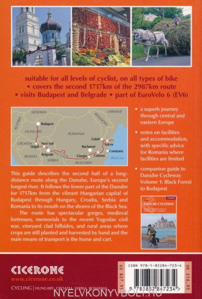 Cycling guidebook to the Danube Cycleway exploring the route from Budapest to the Black Sea, the more adventurous second part of the Danube, suitable for most abilities and bike types. The river route starts in Hungary and continues into Serbia and Bulgaria before ending at Constanta in Romania. The Danube Cycleway is also part of EuroVelo 6 (EV6).