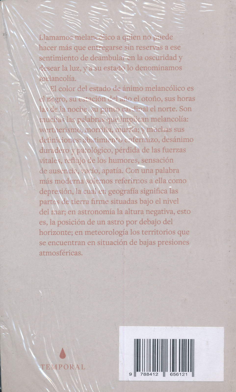 Llamamos melancólico a quien no puede hacer más que entregarse sin reservas a ese sentimiento de deambular en la oscuridad y desear la luz, y a su estado lo denominamos melancolía.La melancolía es recuerdo. Si hubo tormenta, habrá otra. Si hay marea baja, volverá a subir la marea. El hombre melancólico no se fija en lo que hay en un preciso momento, sino que espera la llegada de aquello que en ese momento no es. Se aferra mentalmente a lo previsible, aunque es posible que el recuerdo de lo imprevisible haya hecho ya mella en su confianza en la razón; teme lo que no está y por eso se angustia ante la llegada de aquello que espera.El color del estado de ánimo melancólico es el negro, su estación del ano el otono, sus horas las de la noche, su punto cardinal el norte.