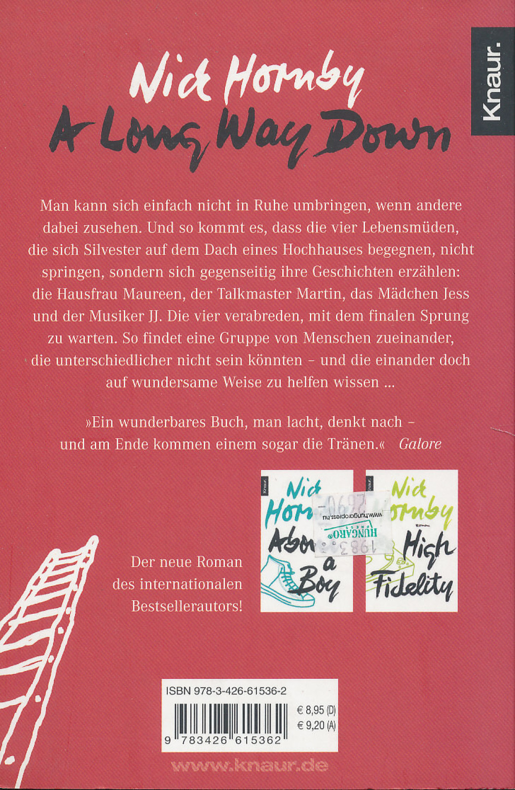 Man kann sich einfach nicht in Ruhe umbringen, wenn andere dabei zusehen. Und so kommt es, dass die vier Lebensmüden, die sich Silvester auf dem Dach eines Hochhauses begegnen, nicht springen, sondern sich gegenseitig ihre Geschichten erzählen: die Hausfrau Maureen, der Talkmaster Martin, das Mädchen Jess und der Musiker JJ. Die vier verabreden, mit dem finalen Sprung zu warten. So findet eine Gruppe von Menschen zueinander, die unterschiedlicher nicht sein könnten – und die einander doch auf wundersame Weise zu helfen wissen …