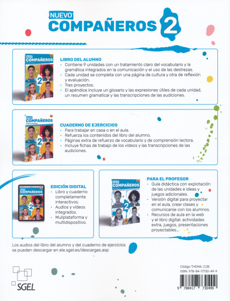 Nuevo Companeros 2 cuaderno de ejercicios consta de una unidad de “Punto de partida” para refrescar los contenidos del nivel anterior y 9 unidades. Cada unidad contiene:Una selección de ejercicios para practicar y consolidar los contenidos del librodel alumno de forma individual o en el aula.Consta de 5 apartados: Vocabulario, Gramática, Comunicación, Comunicación y Vocabulario y Destrezas.” YNuevo apartado de “Refuerzo mi vocabulario”, donde se amplía el vocabulario de la unidad, y de “Algomás”, donde se practica donde se practica la comprensión lectora.Fichas de los vídeos.Transcripción de las audiciones.