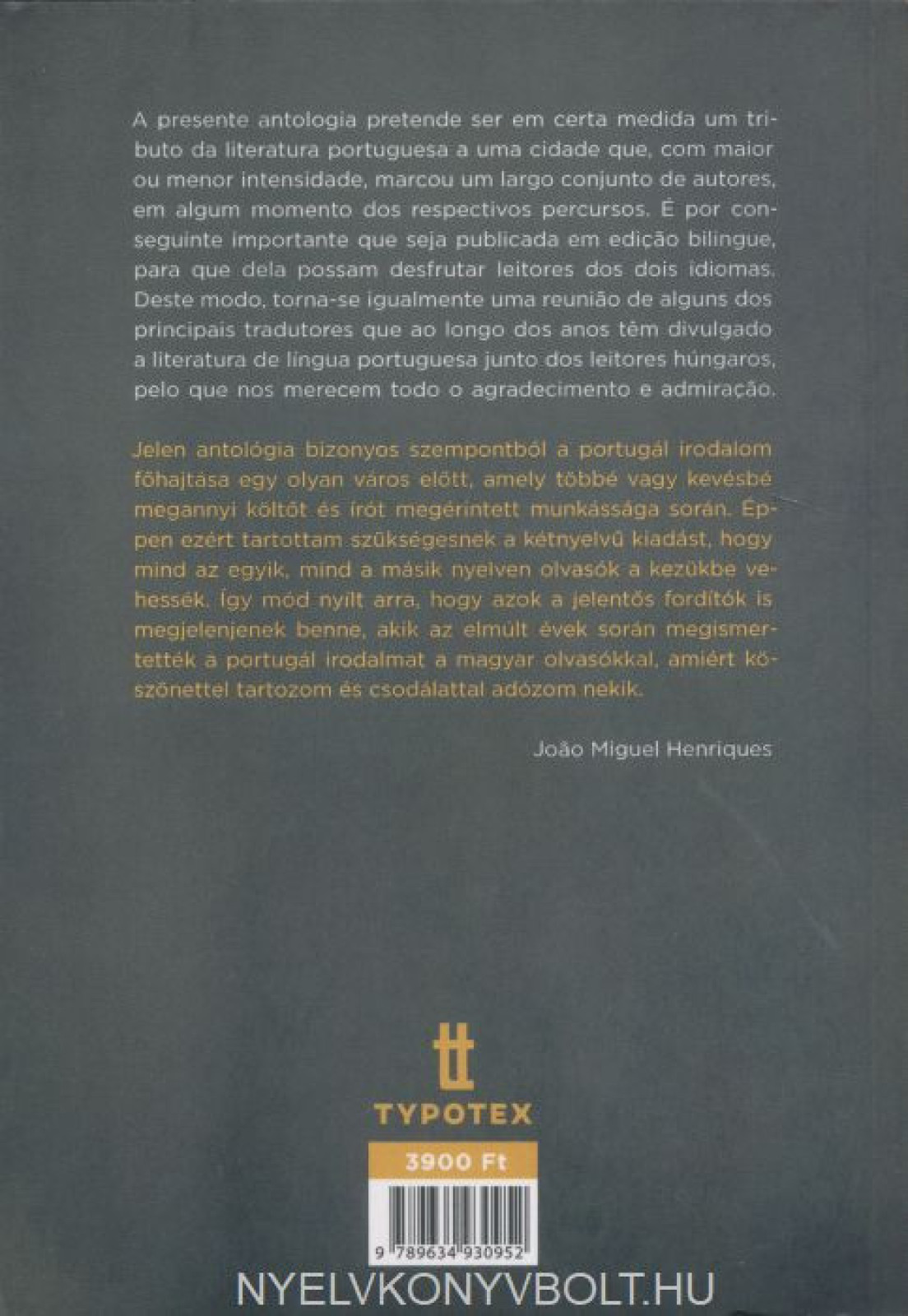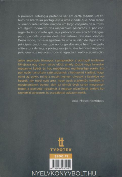 A presente antologia pretende ser em certa medida um tributo da literatura portuguesa a uma cidade que, com maior ou menor intensidade, marcou um largo conjunto de autores, em algum momento dos respectivos percursos. É por conseguinte importante que seja publicada em edicao bilingue, para que dela possam desfrutar leitores dos dois idiomas. Deste modo, torna-se igualmente uma reuniao de alguns dos principais tradutores que ao longo dos anos tem divulgado a literatura de língua portuguesa junto dos leitores húngaros, pelo que nos merecem todo o agradecimento e admiracao.