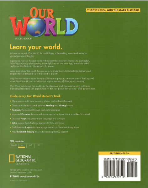 Experience more of the real world with content that motivates learners to use English, including surprising photography, meaningful stories and readings, immersive video, and incredible National Geographic Explorers.Learn more about the world through cross-curricular topics that challenge learners and deepen their understanding of the world in English.Help learners achieve more through collaborative projects, extensive critical thinking and visual literacy work, and activities that inspire meaningful thinking and sharing.Our World truly brings the world into the classroom and improves learning outcomes, motivating learners to use English to show the world what they can do — and achieve more.