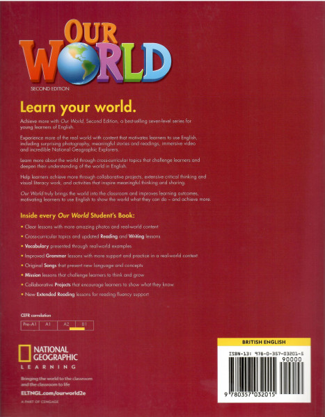 Experience more of the real world with content that motivates learners to use English, including surprising photography, meaningful stories and readings, immersive video, and incredible National Geographic Explorers.Learn more about the world through cross-curricular topics that challenge learners and deepen their understanding of the world in English.Help learners achieve more through collaborative projects, extensive critical thinking and visual literacy work, and activities that inspire meaningful thinking and sharing.Our World truly brings the world into the classroom and improves learning outcomes, motivating learners to use English to show the world what they can do — and achieve more.